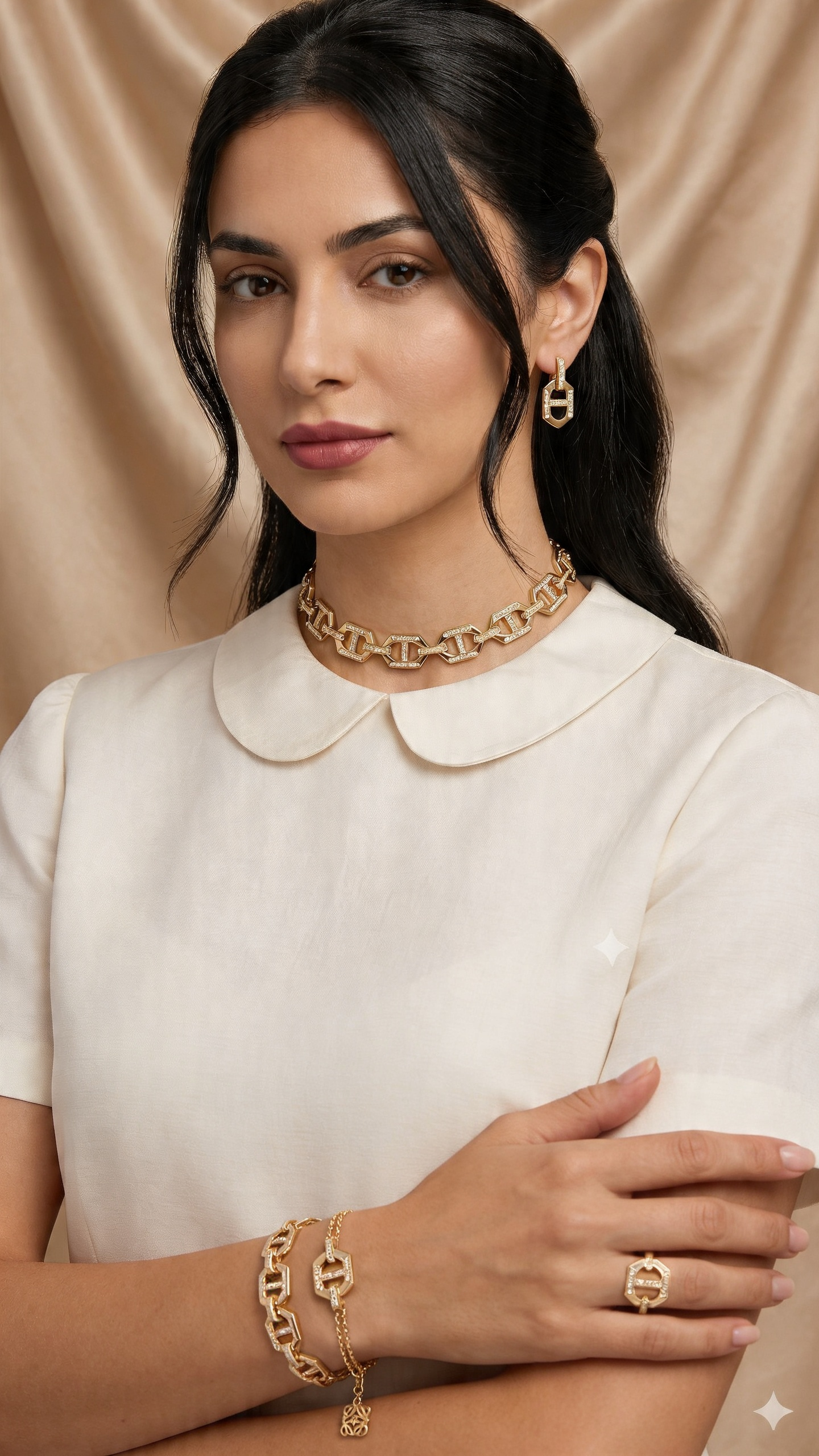 The bold interlocking design is elevated with delicate pavé details, creating a perfect balance between strength and sophistication. Designed to catch the light from every angle, it adds a subtle brilliance to both everyday looks and evening styling.