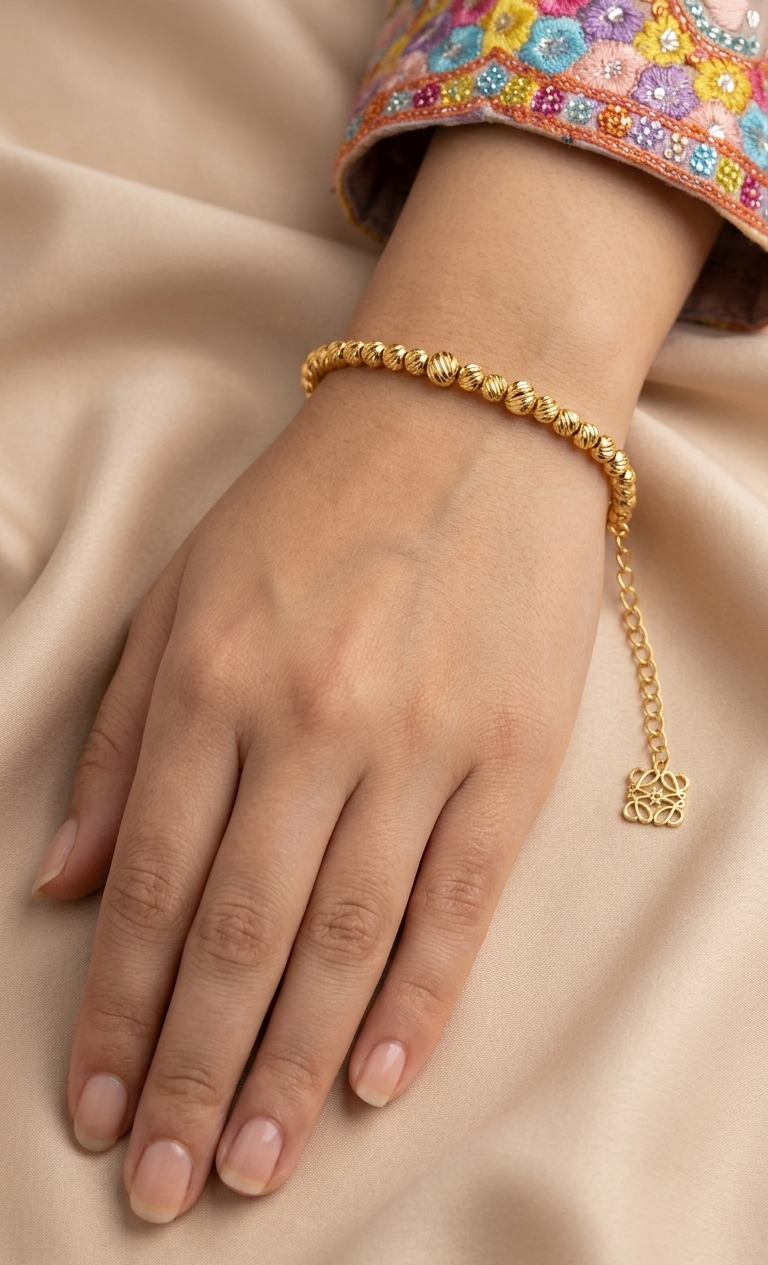 A timeless bracelet designed to add a touch of elegance and sophistication to your everyday style. Crafted with beautifully textured gold elements, this piece reflects light delicately, creating a subtle yet luxurious shine.
