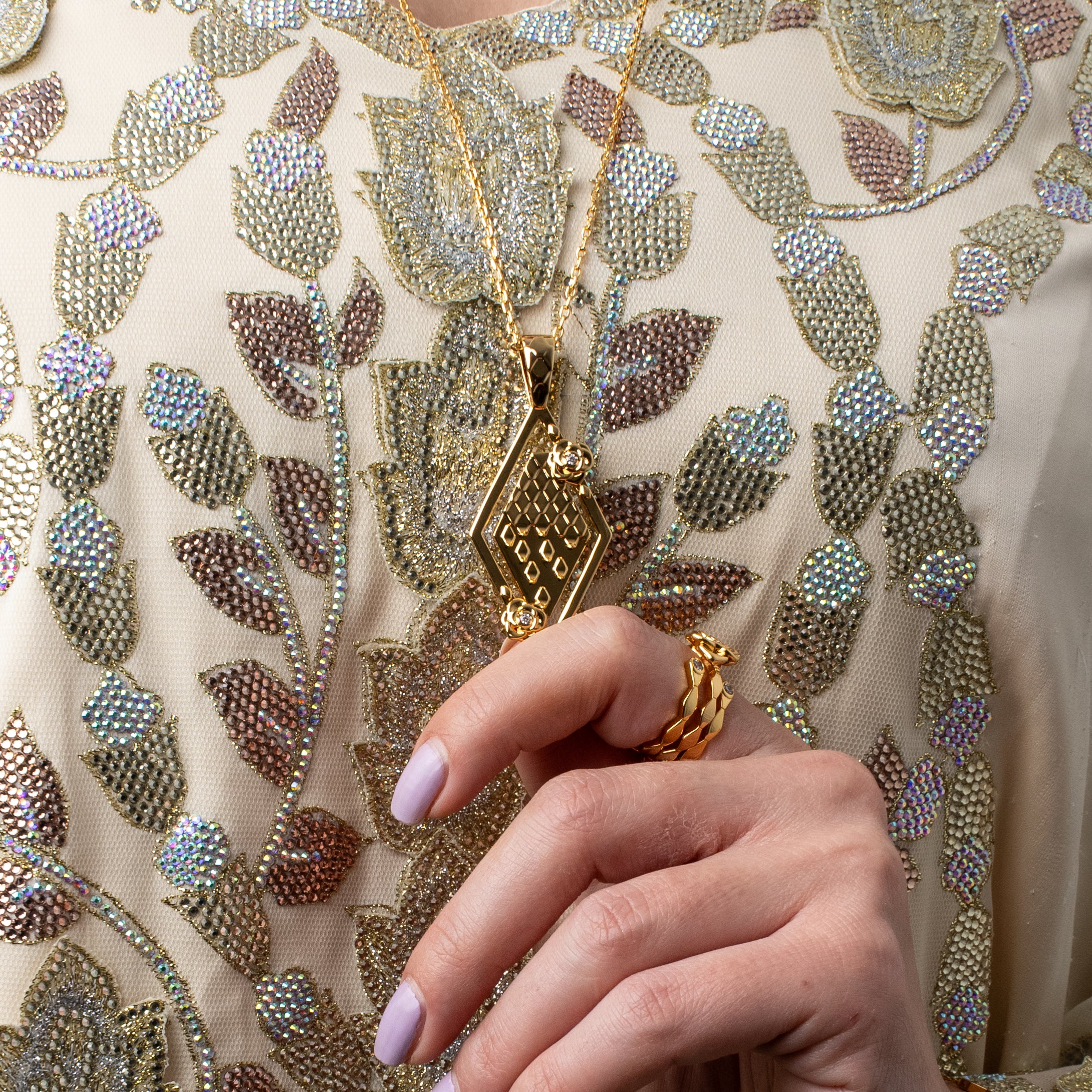 ransform your neckline with the Shahad Long Pendant Necklace, a breathtaking statement piece that combines bold geometric design with intricate artistry. This stunning necklace features a substantial 49mm hexagonal diamond-shaped pendant adorned with an intricate lattice pattern that creates mesmerizing depth and dimension. Crafted from premium brass with luxurious 21K gold plating, this pendant catches light from every angle, creating a captivating focal point that draws eyes and admiration. The adjustable chain allows you to customize the drop to suit your neckline and style preference, while the delicate links provide comfortable wear that doesn't overwhelm. Perfect for making a statement at evening events, weddings, Ramadan iftars, Eid celebrations, or any occasion where you want to shine, this necklace transforms simple outfits into sophisticated ensembles. The geometric lattice work showcases exceptional craftsmanship and attention to detail, reflecting the honeycomb inspiration that defines the Shahad Collection. This isn't jewelry for the faint of heart—it's for the confident woman who appreciates bold design, cultural heritage, and artistic expression. The substantial pendant size (49mm x 25mm) ensures you'll never go unnoticed, while the adjustable length offers versatility for different necklines and styling options. Pair it with a simple black dress for dramatic elegance, layer it over a crisp white shirt for contemporary chic, or wear it with traditional attire for a fusion of heritage and modernity. This necklace is more than an accessory—it's a conversation piece, a confidence booster, and an investment in timeless style that celebrates geometric beauty and your fearless fashion sense.